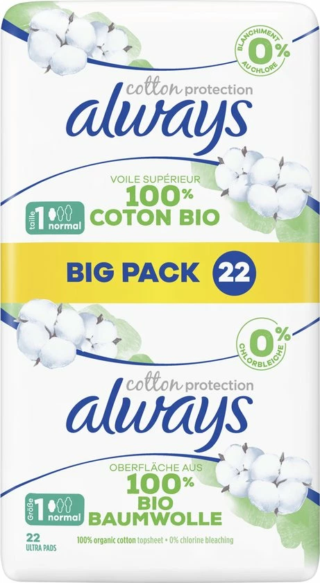 Always Cotton Protection Ultra Maandverband heeft een toplaag uit 100% biologisch katoen. Het maandverband bevat geen parfum, kleurstoffen en chloorbleekmiddelen. Het is goedgekeurd door de dermatologen van SHA (Skin Health Alliance) en zijn gecertificeerd door Cotton Inc. De kern bevat een ultra absorberende gel die vocht omzet in gel en zo doorlekken voorkomt. Always Cotton Protection Normal is ideaal voor een lichte menstruatie met lingeriemaat S en M of voor een gemiddelde menstruatie met lingeriemaat S.