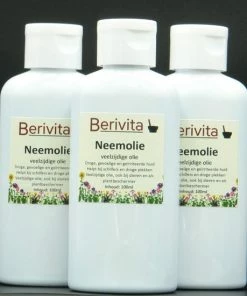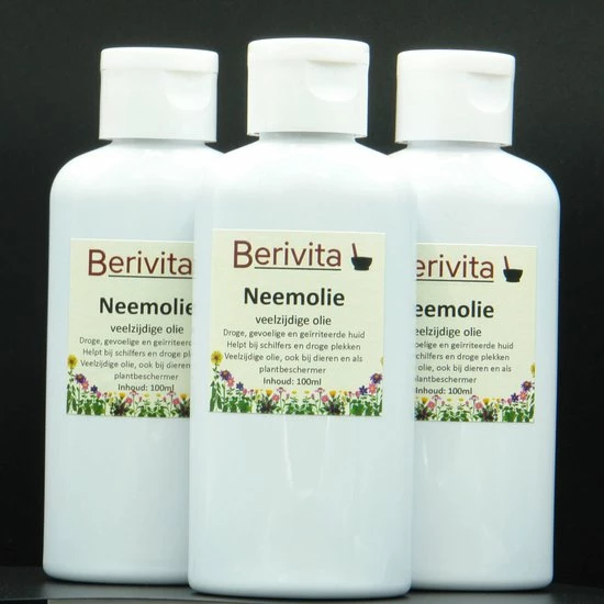 3x100ml flessen met hoge kwaliteit 100% pure Neemolie, in handige flessen van 100ml, met klepdopje. Deze natuurlijke en plantaardige Neemolie wordt gewonnen door koude persing van zaadjes uit Neemvruchten, afkomstig van de Azadirachta indica boom.