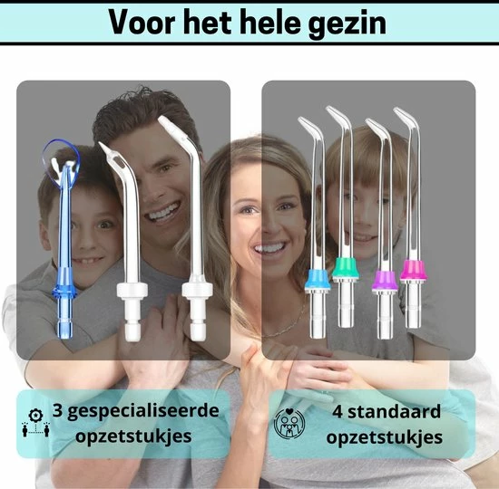 Deze waterflosser wordt geleverd met maarliefst 7 verwisselbare opzetstukjes. U ontvangt 4 normale opzetstukjes. Op deze manier kun je de waterflosser op een hygiΓ«nische manier voor het hele gezin gebruiken. Het parodontale opzetstukje zorgt ervoor dat zelfs de kleinste spleetjes in je gebit gereinigd worden. Ook bevat het een orthodontisch opzetstukje, speciaal voor beugels en spalkjes. De tongreiniger zorgt voor een frisse adem.