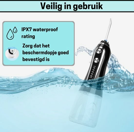 De draadloze waterflosser beschikt over een IPX7 rating, dit betekent dat het apparaat minimaal 30 minuten lang één meter diep onder water gehouden kan worden. Dit zorgt ervoor dat het flosapparaat veilig te gebruiken is onder de douche of in bad.