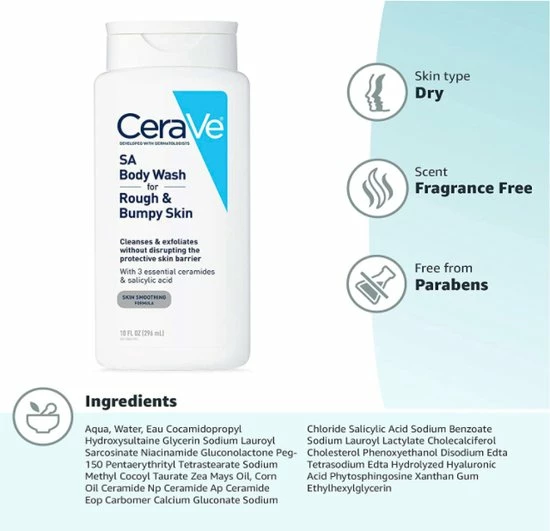 Cerave SA body wash is een van de meest effectieve manieren om de huidtextuur te verbeteren. We raden een zachte exfoliërende salicylzuur body wash aan, samengesteld met ceramiden om de natuurlijke barrière van de huid te helpen herstellen, hyaluronzuur en niacinamide hydraterend. CeraVe SA Body Wash voor ruwe en hobbelige huid combineert deze ingrediënten om de ruwe, hobbelige huid glad te maken en te verbeteren. CeraVe SA Body Wash voor een ruwe en hobbelige huid biedt een zachte, niet-irriterende reiniging plus exfoliatie om de huidtextuur te verbeteren zonder harde microbolletjes die de huid kunnen krassen. Daarnaast bevat onze salicylzuur body wash niacinamide om de huid te kalmeren, hyaluronzuur om het natuurlijke vocht van de huid vast te houden en drie essentiële ceramides om de beschermende barrière van de huid te behouden.