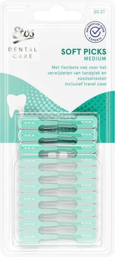 Etos soft picks M zijn flexibele tandenstokers met een siliconen buitenkant. Door het flexibele handvat zijn alle ruimtes goed te bereiken.