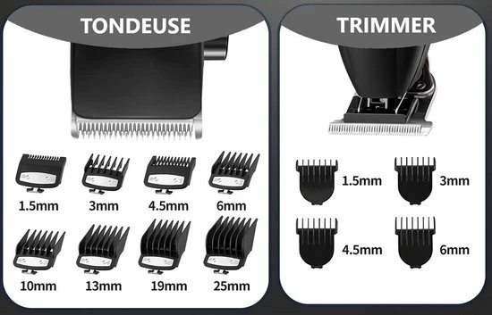 De grote tondeuse wordt geleverd met 8 verschillende opzetstukken waarmee je zelf de lengte van het haar kan bepalen. De verschillende opzetstukken hebben een lengte van 1.5mm, 3mm, 4.5mm, 6mm, 10mm, 13mm, 19mm en 25mm.