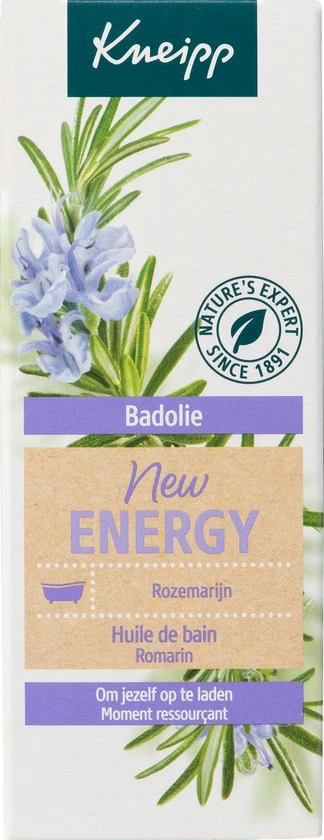 De activerende en verfrissende Kneippยฎ Badolie New Energy bevat waardevolle natuurlijke etherische rozemarijnolie. De combinatie van het warme water, de intens rode kleur en de kruidige geur van rozemarijnolie geeft je nieuwe energie.