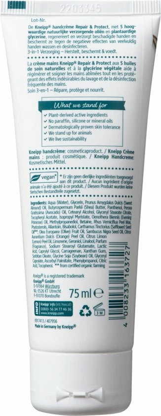De Kneipp handcrème Repair & Protect is een speciale handcrème voor droge tot extreem droge handen. De crème bevat 5 hoogwaardige natuurlijke verzorgende oliën en plantaardige glycerine. 3-in-1 Verzorging: herstelt, beschermt & voedt:
