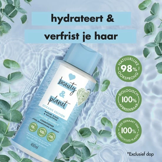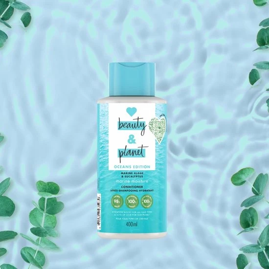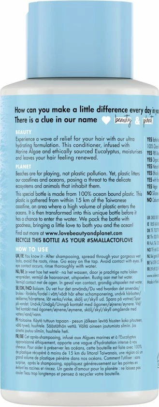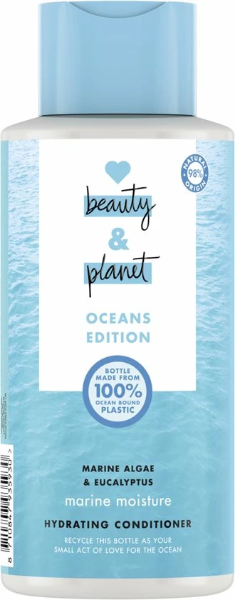 Love Beauty and Planet Marine Algae & Eucalyptus Marine Moisture conditioner geeft een hydratatie boost aan alle soorten haar. Deze vochtinbrengende conditioner is gemaakt met ingrediΓ«nten van natuurlijke en duurzame oorsprong. De formulering, verrijkt met Marine Algae complex, bevat essentiΓ«le vitamines, anti-oxidanten en mineralen, hydrateert het haar voor een stralende look. Geniet van de verkwikkende en rustgevende geur van ethisch verantwoord geproduceerde eucalyptus, geliefd om zijn verkoelende werking. Bij Love Beauty and Planet geloven we in effectieve natuurlijke verzorgingsproducten, ofwel in beauty zonder concessies. Vanaf nu kun je met elke douche een klein verschil maken voor de planeet. De Love Beauty and Planet Oceans Edition is geΓ―nspireerd door onze liefde voor de oceanen, daarom zijn de flessen gemaakt van 100% Ocean Bound Plastic. Ocean Bound Plastic is plastic afval langs kustlijnen, stranden en waterwegen dat in de oceanen dreigt te belanden. Het plastic voor deze flessen is verzameld langs de kustenlijnen in AziΓ«. Het plastic afval wordt hergebruikt en gerecycled voor de flessen van deze Oceans Edition lijn. De formule van onze conditioners is bovendien 100% biologisch afbreekbaar en bestaat voor 98% uit ingrediΓ«nten van natuurlijke oorsprong (de overige 2% is om de kwaliteit en veiligheid van het product te garanderen). Goed voor jou, en goed voor de planeet. Je weet hoe het werkt: na het wassen, door je prachtige natte haar verspreiden, vermijd de haaraanzet, uitspoelen. Gebruik niet meer water dan nodig. Voor ultieme hydratatie was je eerst je haar met de Love Beauty and Planet Marine Algae & Eucalyptus Marine Moisture shampoo. Probeer ook ons assortiment aan huidverzorgingsproducten, zoals de Marine Algae & Eucalyptus showergel en Marine Algae & Eucalyptus bodylotion. De producten zijn verkrijgbaar in 6 heerlijk ruikende lijnen met ingrediΓ«nten van natuurlijke oorsprong zoals biologische kokosolie, muru muru-boter, rozenolie, ylang ylang, sheabutter en lavendel. Love Beauty and Planet combineert verzorgingsproducten met Small acts of Love voor de planeet. We werken hiervoor samen met duurzame lokale ondernemers die zich, net als wij, inzetten voor het hergebruik van materialen. Zo zetten we samen een mooie beweging in gang. Doe je mee?