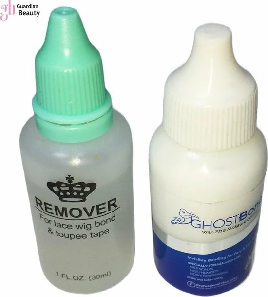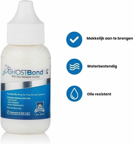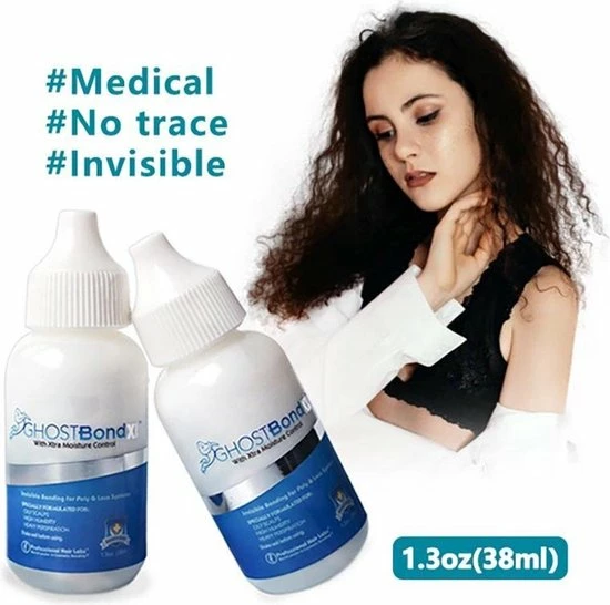 De vloeibare lijm van Pro Hair Labs Ghost bond XL is een nieuwe, nog sterkere formule die huidvet en transpiratie wegneemt. Het is bedoeld voor zowel kanten haarstukjes als haarstukjes met een plakrand.