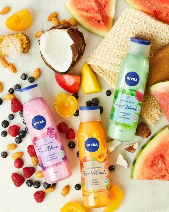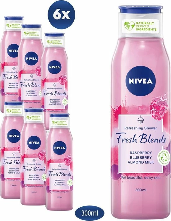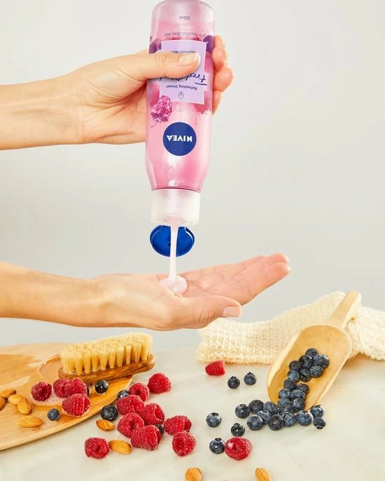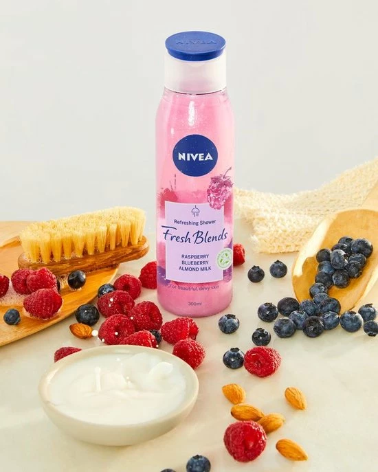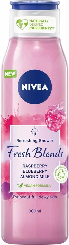 NIVEA Fresh Blends Verfrissende Douchegel met framboos, bosbes en amandelmelk geeft je huid een fijn gevoel en de planeet wat liefde. De heerlijke en verfrissende 98% biologisch afbreekbare formule* is met liefde geblend met ingrediΓ«nten van natuurlijke oorsprong**, fruitextracten en plantaardige melk. Ja, onze flessen zijn misschien een beetje grijs, maar dat komt doordat ze van tot wel 100% recycled plastic gemaakt zijn (de dop uitgezonderd). Zo kunnen we samen onze impact op het milieu verminderen. *Volgens OESO 301/302. **IngrediΓ«nten uit de natuur behouden na verwerking meer dan 50% van hun natuurlijke staat, inclusief water