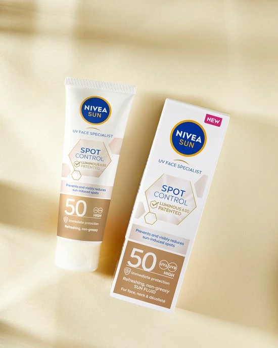 NIVEA SUN Face Luminous Anti-Spot SPF50 beschermt je tere gezichtshuid onmiddellijk tegen UV-stralen. Het voorkomt en vermindert zichtbaar door de zon veroorzaakte vlekken dankzij het gepatenteerde ingrediënt Luminous630. Voor een egale en stralende teint. De lichte en niet-vette zonnecrème zorgt voor een verfrissend effect. De formule respecteert de oceaan door vrij te zijn van UV-filters Octinoxate, Oxybenzone en Octocrylene.