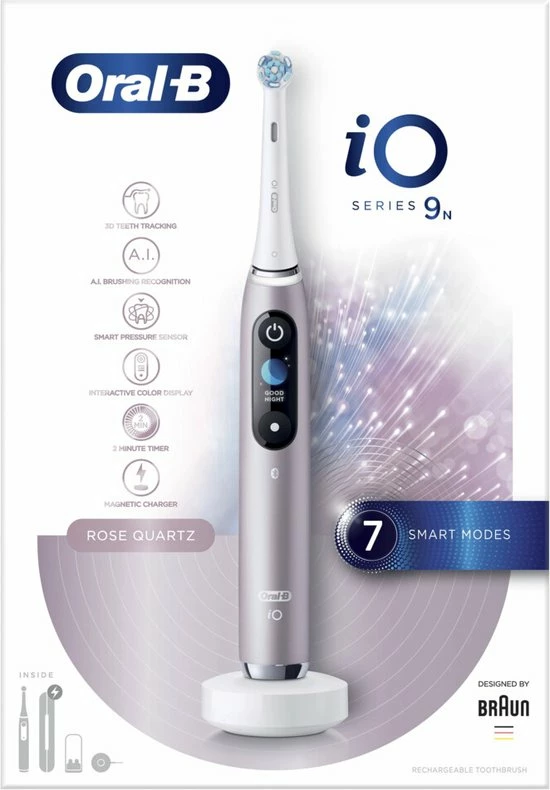 - Bevat: 1 iO9-handvat met ultimate clean opzetborstel, 1 oplaadreisetui, 1 oplader, 1 opzetborstelhouder