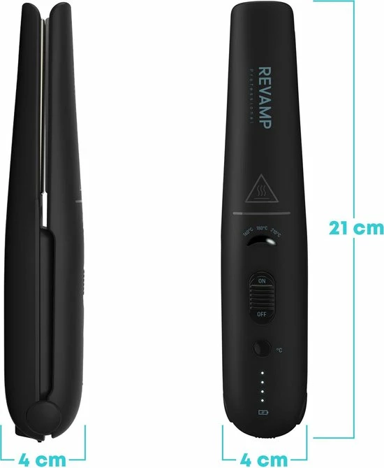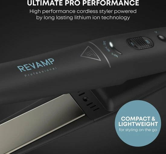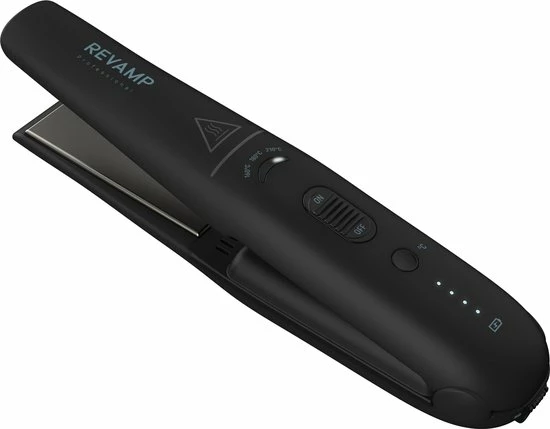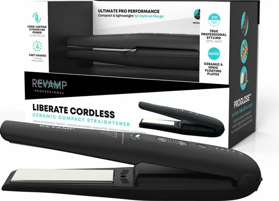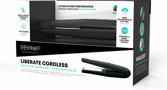 De Revamp Progloss ST-1700 Liberate maakt het mogelijk om je haar te stylen waar je ook bent. De stijltang is compact en is draadloos tot wel 30 minuten te gebruiken. De 3 instelbare temperatuurstanden variΓ«ren van 160 Β°C tot 210 Β°C. De keramische platen bevatten een gepatenteerde Progloss coating die het haar beschermt en een prachtige glans meegeeft. De meegeleverde oplaadkabel heeft verwisselbare adapters voor de UK en EU. De stijltang bevat ingebouwde reisbeveiliging en wordt geleverd met een reisetui om hem gemakkelijk mee te nemen.