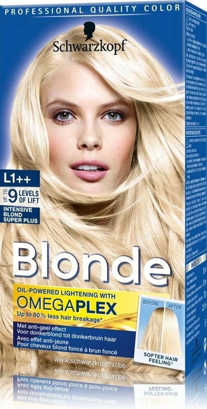 Schwarzkopf Blonde Intensief Super Plus zorgt ervoor dat het haar nog een paar tinter lichter wordt dan het al was. De haarverf zorgt niet alleen voor een mooie blonde tint, het verzorgd en versterkt ook het haar. Geniet van een gezonde coupe dankzij deze Schwarzkopf Blonde Intensief Super Plus. Het licht het haar 6 tot 8 tinten op zonder een gele gloed.