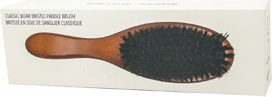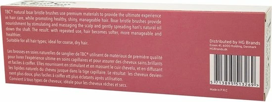 De haarborstel is met echt everzwijnhaar en met een handvat van essenhout. Het wilde zwijnenhaar stimuleert en masseert de hoofdhuid, en zorgt er tegelijkertijd voor dat de natuurlijke oliën van het haar door het hele haar worden verspreid. De TBC® van everzwijnhaar kan worden gebruikt voor alle haartypes – vooral als u last heeft van droog en/of pluizig haar.