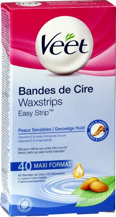 De gelformule met Veet Easy-Gelβ’ technologie:β’ Vloeit rond de kortste haartjes** en grijpt deze actief vast, maar niet de huid. ** 1.5mmβ’ Verwijdert haartjes vanaf de wortel, voor een zachte huid, tot 28 dagen.*Geniet van de prettig aanvoelende geltextuur op de huid, de heerlijke geur en de prachtige kleur. Daardoor is het resultaat van de eerste keer al perfect, zelfs voor mensen die geen ervaring hebben met waxstrips.Speciale formule met Amandelolie die bekend staan om hun goede eigenschappen voor een gevoelige huid, en geparfumeerd met Korenbloem.Deze verpakking bevat 40 ontharingsstrips voor de lichaam en benen en 4 nabehandelingsdoekjes.* Klinische studie bij 30 vrouwen β 2016