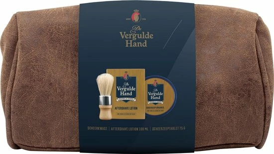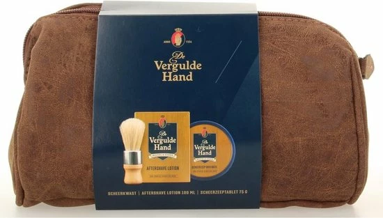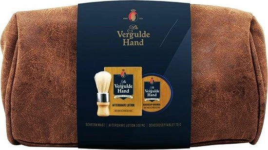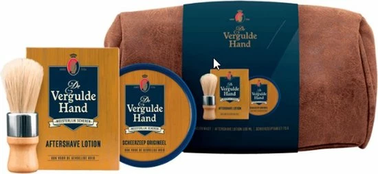 Luxe giftset van De Vergulde Hand. De set bevat een heerlijke scheerzeep die rijkelijk schuimt en ervoor zorgt dat het mes gemakkelijk over de huid kan glijden.